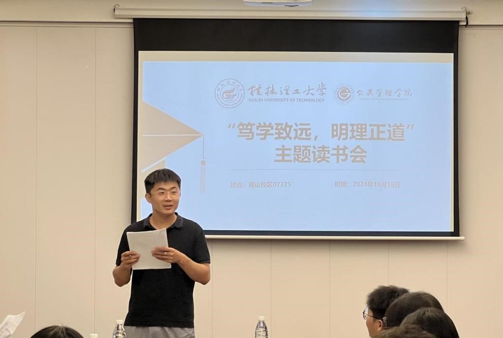 我院于10月18日下午15点在雁山校区07325教室举办了“笃学致远,明理正道”主题读书会。会议由学工组长马树振老师出席并发言,2023级研究生胡俊宇、刘梦龙、杨舒媛担任宣讲人,2023级研究生赵涛伟担任主持人,2023级、2024级全体研究生参与。