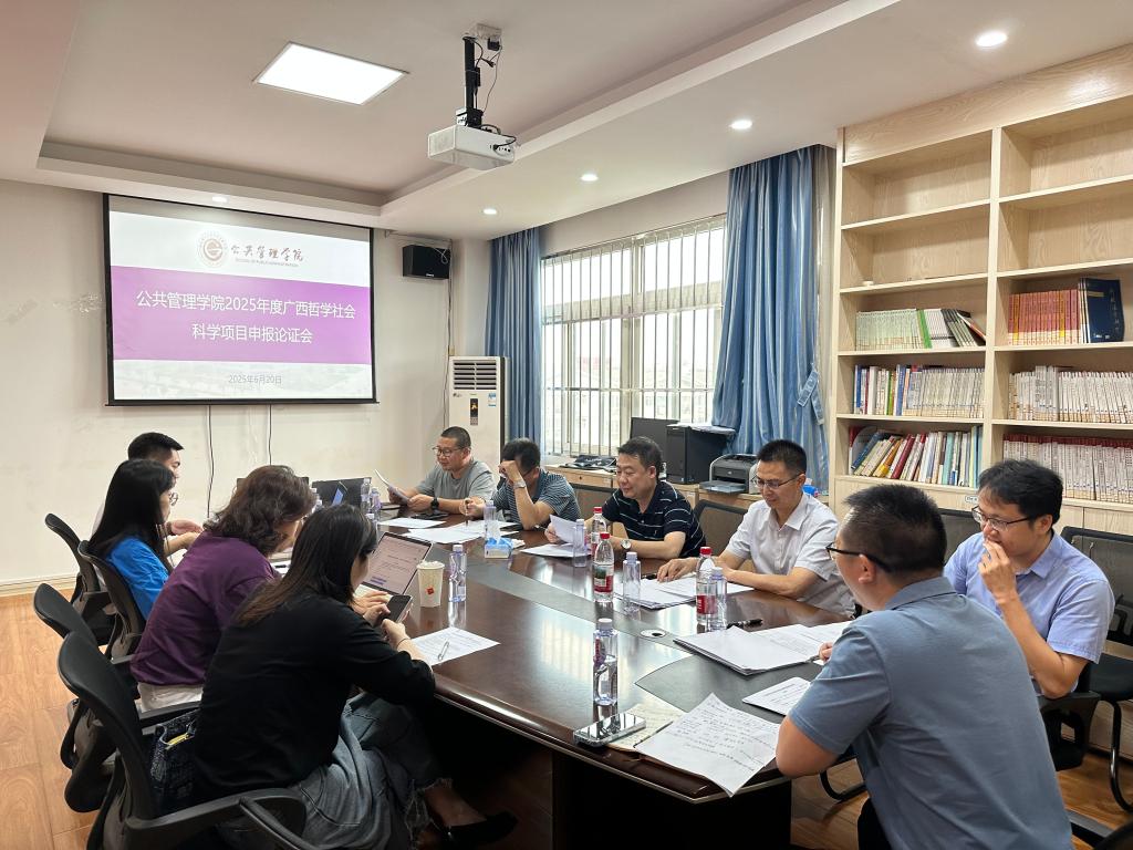 为进一步提升广西哲学社会科学课题申报的成功率与学术质量,2025年6月20日下午,在屏风校区7705会议室组织召开2025年度广西哲社研究项目申报论证会。会议由彭正波教授主持,卢智增教授、张兴旺教授、褚清华教授、章昌平教授组成专家评审组,对拟申报老师们的项目选题方向、研究框架及申报书内容进行全方位指导。