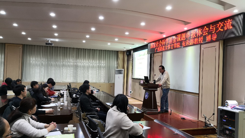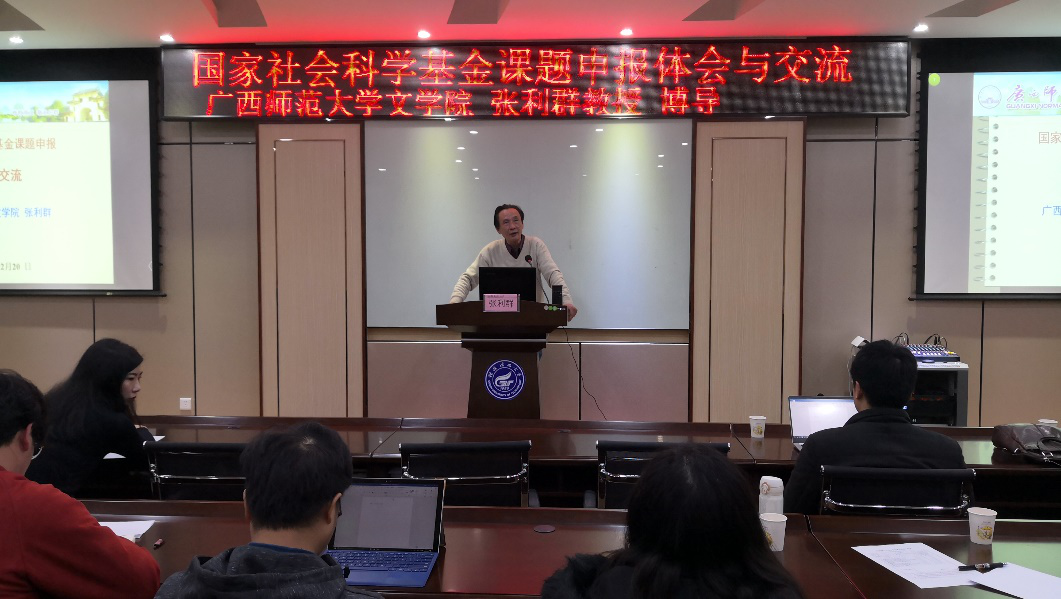 为进一步做好我院2019年度国家哲学社会科学基金项目申报工作,提高我院国家社科基金项目申报成功率,2018年12月20日下午2点30分,应学院邀请,国家社科基金重大项目获得者、广西师范大学文学院博士生导师张利群教授在我校屏风校区07106报告厅作了题为“国家社会科学基金课题申报体会与交流”的专题辅导讲座。讲座由我院副院长教授何德珍主持,各教研室相关教师到场聆听讲座。