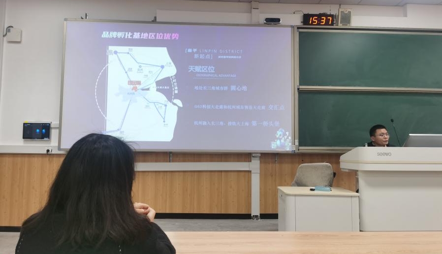 宣讲人朱玉醒从企业主体、招聘岗位、办公环境、福利待遇等四方面展开介绍,阐明孵化基地依托杭州市临平区的区位、产业人才等先天优势,汇聚产品研发设计、品牌策划及营销、电商直播跨境贸易服务等产业要素,打造产业生态以国家级开发区为承接平台,集结产业生态链服务的优质企业和品牌公司。