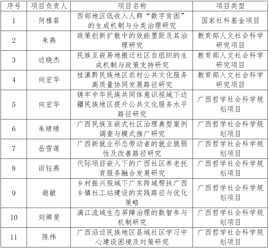 我院一直坚持开展有组织科研,营造良好的科研氛围。在系统科研培育机制下,2024年我院获得1项国家社科基金项目、3项教育部人文社会科学研究项目以及7项广西哲学社会科学规划项目。我院科研项目立项再获佳绩,标志我院科研水平又上新台阶,充分彰显了我院中青年教师良好的科研发展潜力。