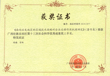 根据《广西壮族自治区人民政府关于奖励广西第十三次社会科学优秀成果的决定(桂政发〔2014〕68 号)》,广西壮族自治区第十三次社会科学优秀成果奖,经过各高校推荐、评选委员会评审、面向社会公示和自治区人民政府批准等过程,现已揭晓。我院曾鹏教授的著作《面向后发地区的区域技术战略对企业迁移作用机理研究》获三等奖。