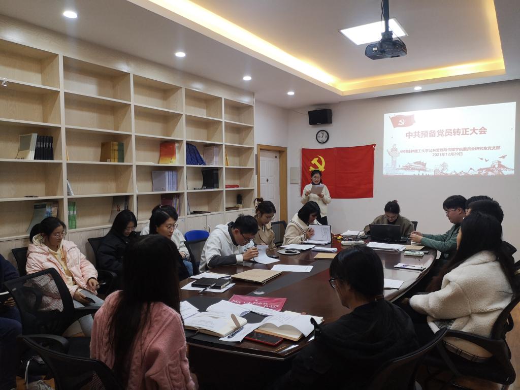 2021年12月20日,公共管理与传媒学院研究生党支部于7705会议室召开预备党员转正会议,讨论关于王洁同志、付稳同志申请转为正式党员的问题。参加本次大会的有支部书记王静、副书记董丽莹等23名支部成员,会议由副书记董丽莹进行主持。