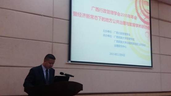 为促进学术交流,2015年12月6日,学院主持工作的副院长曾鹏教授带领副院长唐重振副教授、彭正波副教授及行政管理教研室相关教师一行6人出席广西行政管理学会2015年年会暨经济新常态下的地方公共治理与发展学术研讨会。